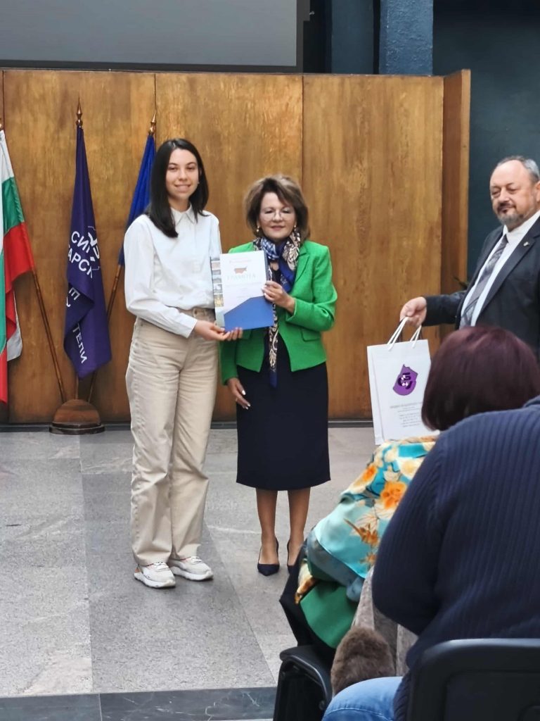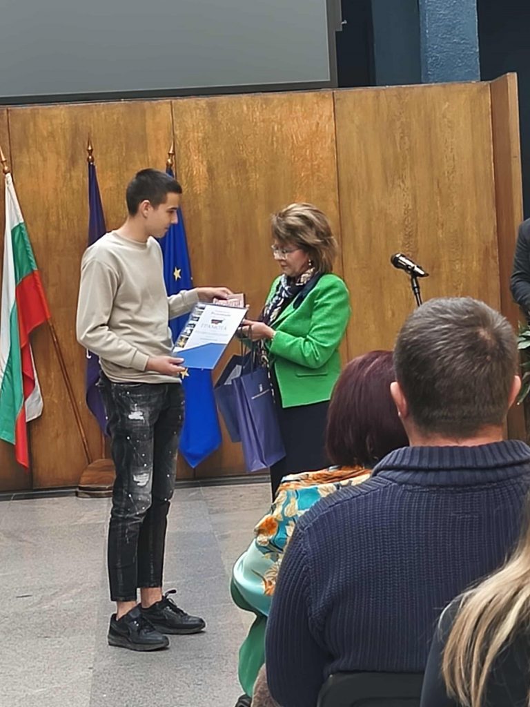 Георги Папратилов от 12Г клас, взе специалната награда на конкурса, която му беше връчена от заместник-министъра на образованието и науката г-жа Наталия Михалевска. Той участва с презентацията на тема “Копривщица – извор на родолюбие и възрожденски дух” в направление „Борбата за национално освобождение“. В проектната разработка Георги използва лични снимки от посещение във възрожденския град и материали, предоставени от негови съученици.